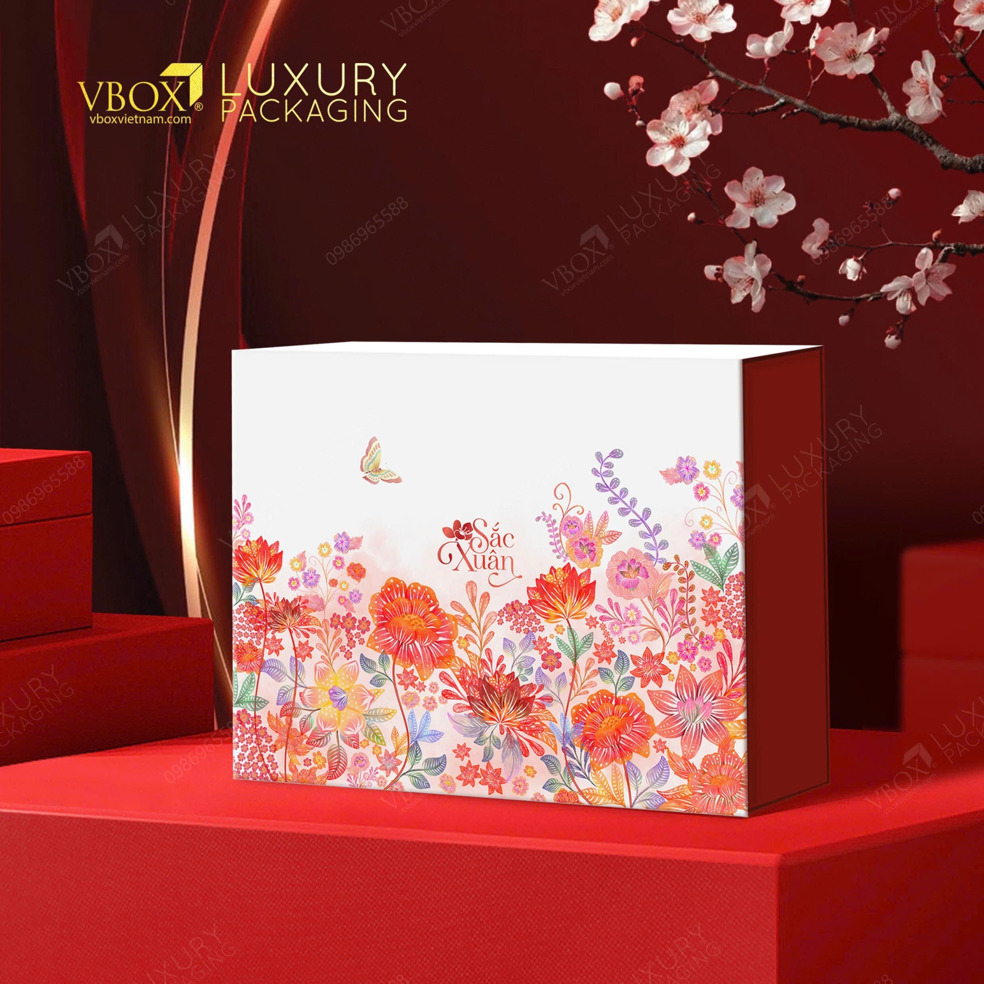 Giữa khung cảnh ấy, cánh bướm khẽ đập đôi cánh mỏng, nhẹ như hơi thở, nhưng đủ để làm rung động cả không gian, như nhắc ta rằng sự sống đang căng tràn trong từng khoảnh khắc. Chiếc hộp như một làn gió xuân đi qua, mùi hương dịu dàng quyện lại, đưa con người vào một miền Tết tươi trẻ và rộn rã.