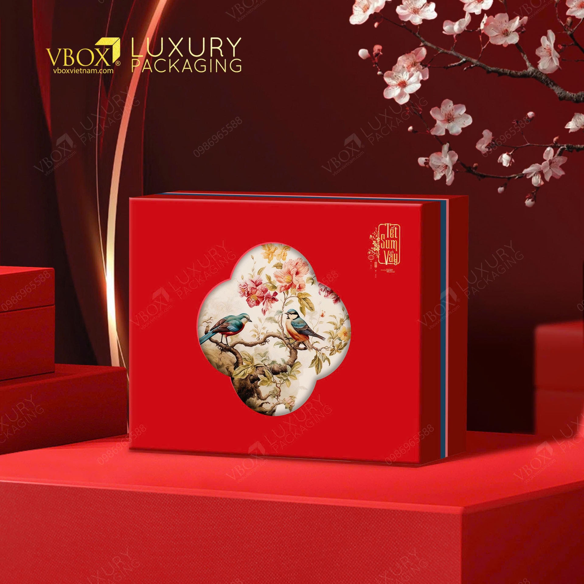Chiếc hộp Tết Sum Vầy như một lời gợi nhắc đến giây phút đoàn viên thiêng liêng mỗi độ Tết về. Trong văn hóa Á Đông, đôi chim luôn gắn với sự sum họp, tình thân. Khi được đặt vào khung cảnh rừng hoa nở rộ, một câu chuyện mùa xuân được mở ra: đó là khoảnh khắc những tâm hồn tìm về bên nhau, sẻ chia niềm vui, xua tan giá lạnh, trao nhau những lời hẹn ước rằng xuân này, hạnh phúc sẽ lại tròn đầy.